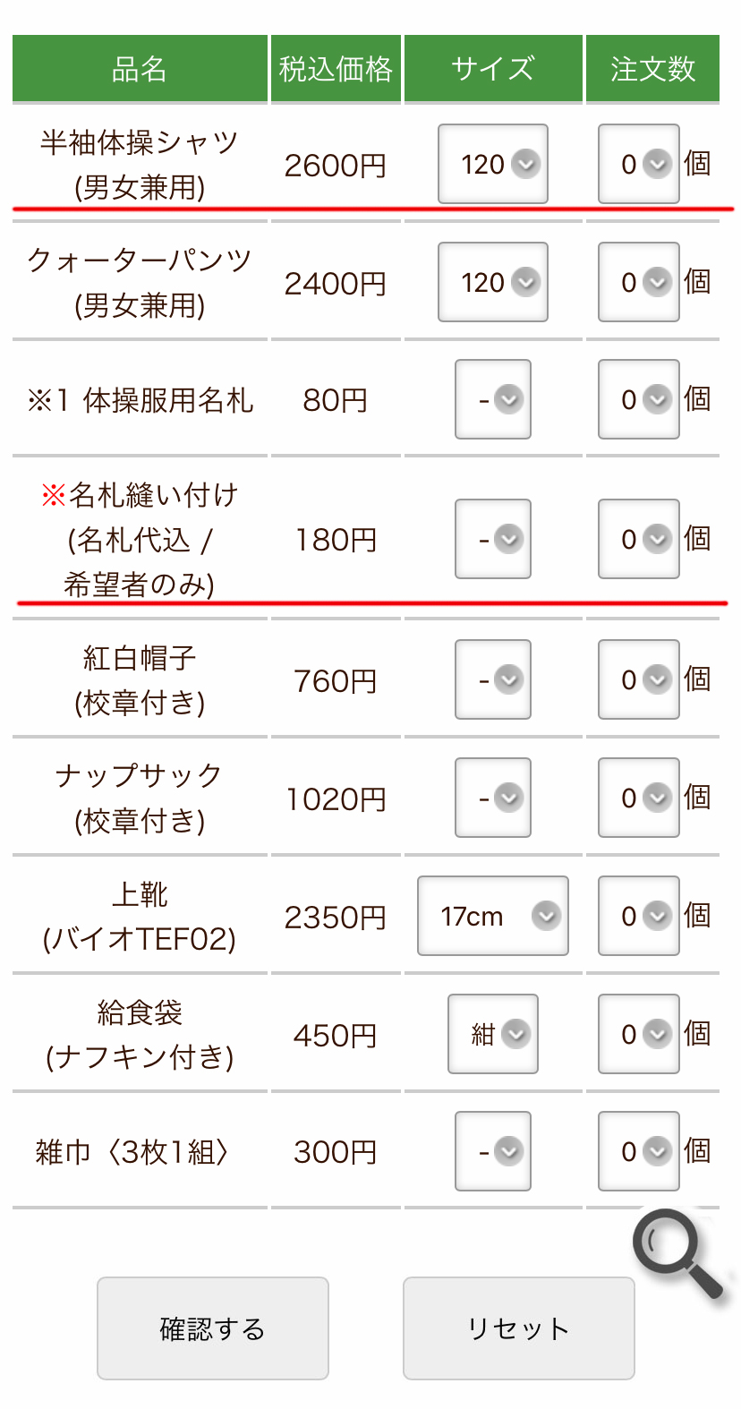 名札のみの購入を希望される方は、"※1 体操服用名札" をお選び下さい。