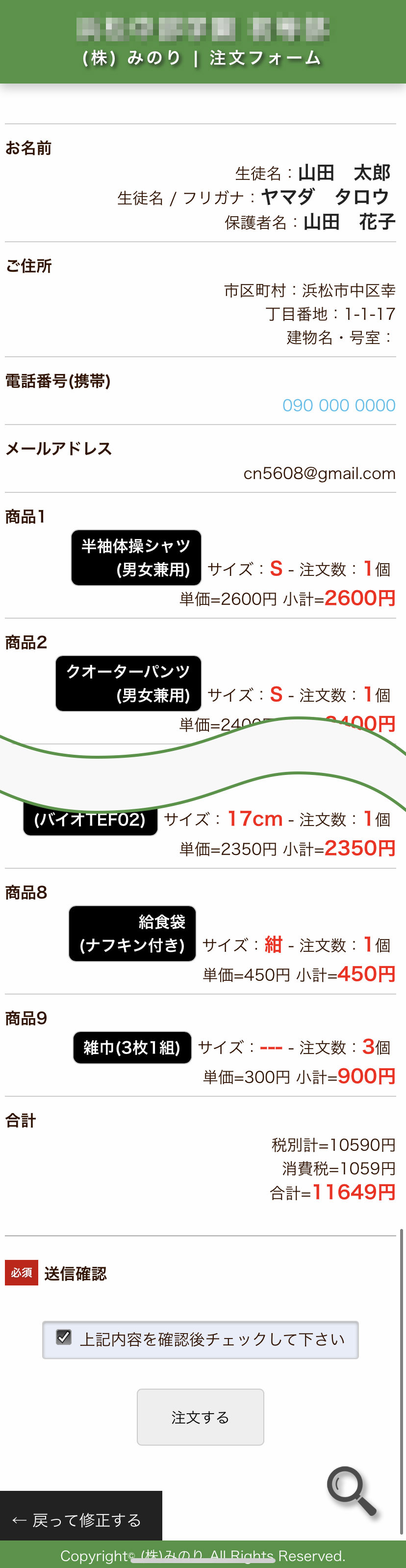 注文内容を修正する場合は左下、または右上の [ ←戻って修正する ] より修正して下さい。